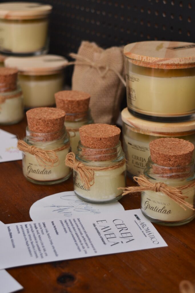 Cada vela é produzida de forma artesanal, utilizando materiais recicláveis e embalagens eco-friendly, promovendo o bem-estar ambiental.